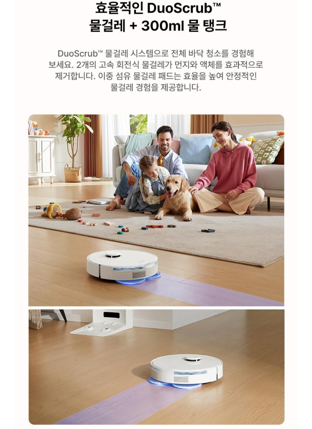 "반려견 때문에 청소를 자주 해야 했는데, 이젠 로봇이 다 해줘서 너무 편해요. 앱으로 스케줄 설정도 되고, 복층 집에서도 잘 작동해요."— 박○○ / 반려동물 집사